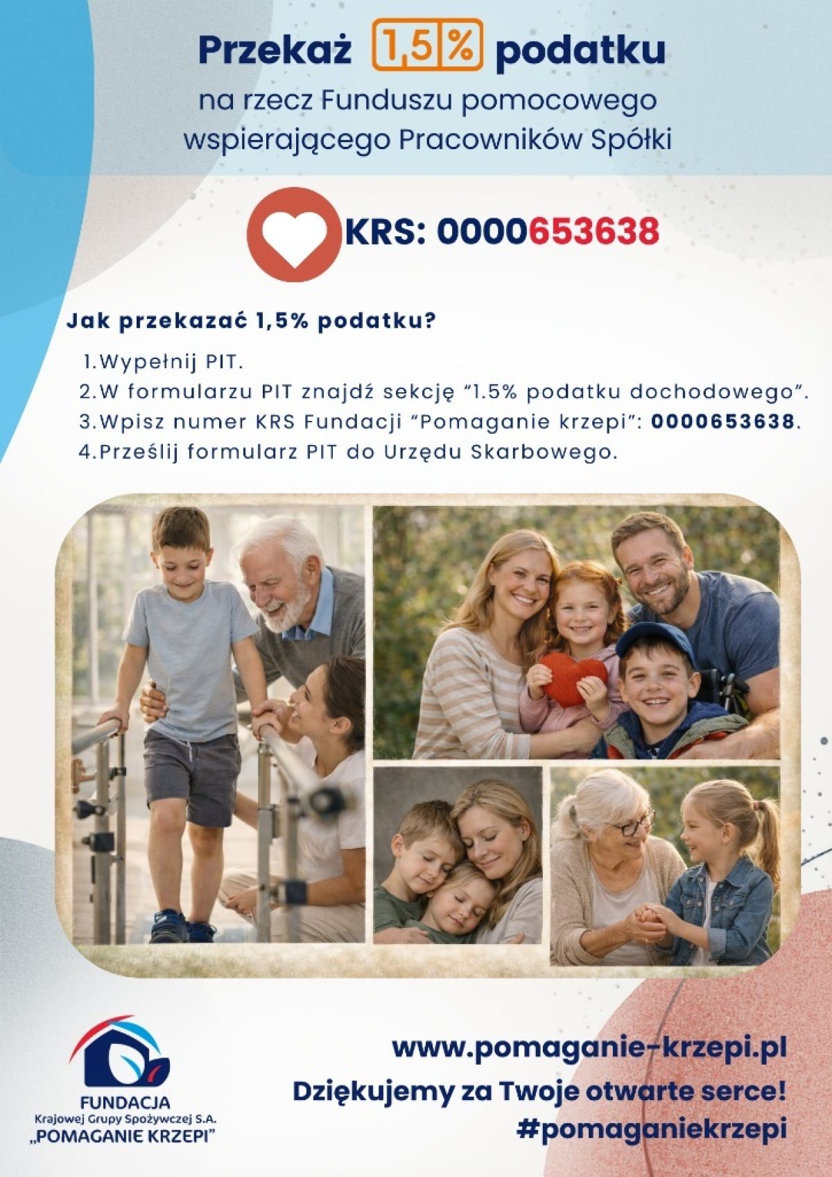 Zachęcamy do przekazania 1,5% podatku na FUNDUSZ POMOCOWY DLA PRACOWNIKÓW Krajowej Grupy Spożywczej S.A., którego celem jest dofinansowanie kosztów długotrwałego leczenia, rehabilitacji oraz pomoc w sytuacjach losowych Pracowników Spółki oraz członków ich najbliższych rodzin.